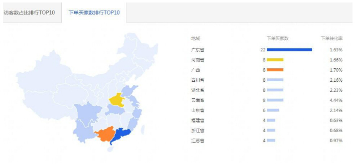 3、也可以在生意参谋找到流量-----访客分析-----地域分布-----下单买家排行(如下图)
