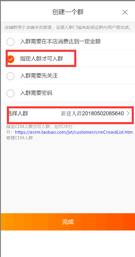 第二步,开始创建一个群,选择指定人群才能入群,人群就选择刚刚我们创建的标签人群。